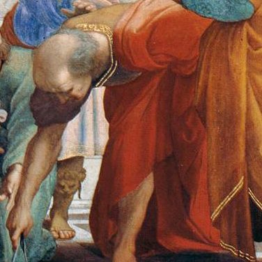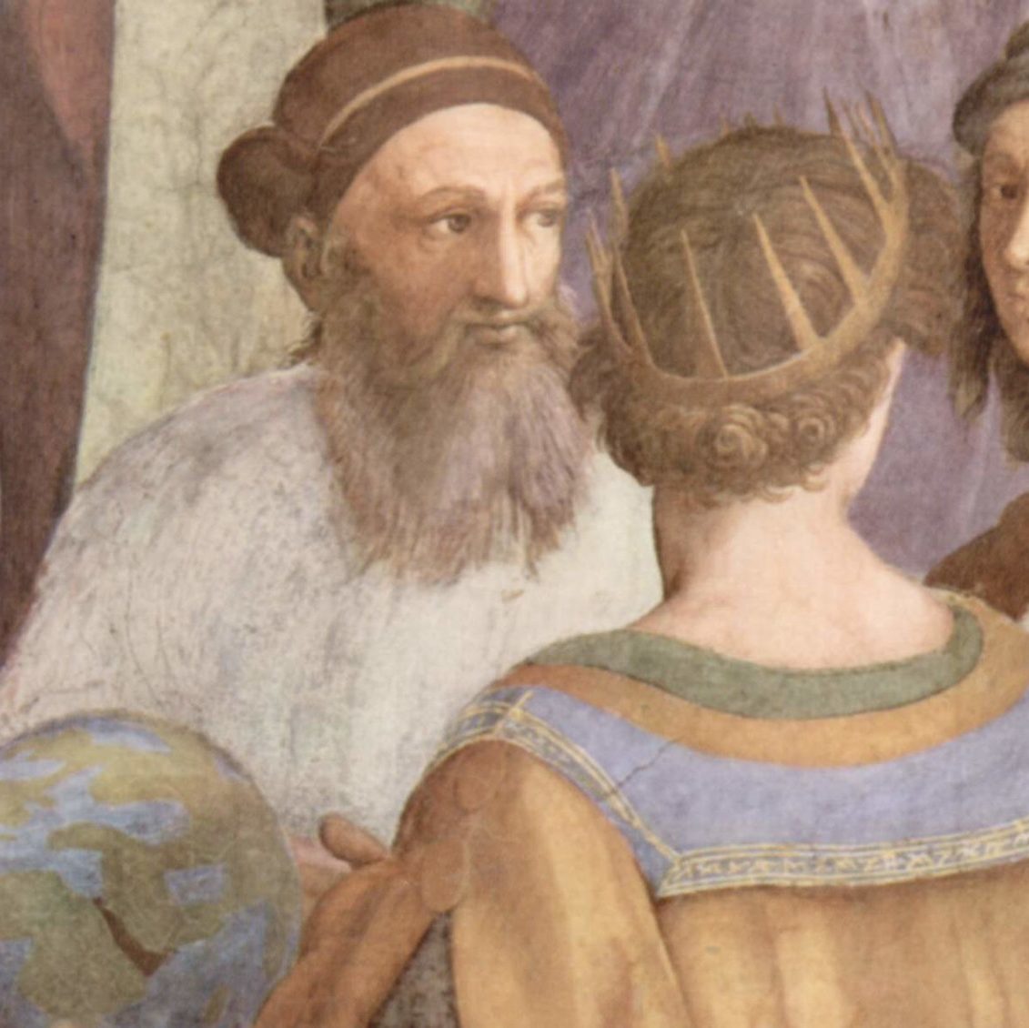 The School of Athens is one of a group of four main frescoes on the walls of the Stanza (those on either side centrally interrupted by windows) that depict distinct branches of knowledge. Each theme is identified above by a separate tondo containing a majestic female figure seated in the clouds, with putti bearing the phrases: “Seek Knowledge of Causes”, “Divine Inspiration”, “Knowledge of Things Divine” (Disputa), “To Each What Is Due”. Accordingly, the figures on the walls below exemplify philosophy, poetry (including music), theology, and justice.[7][8] The traditional title is not Raphael’s. The subject of the painting is actually philosophy, or at least ancient Greek philosophy, and its overhead tondo-label, “Causarum Cognitio”, tells us what kind, as it appears to echo Aristotle’s emphasis on wisdom as knowing why, hence knowing the causes, in Metaphysics Book I and Physics Book II. Indeed, Plato and Aristotle appear to be the central figures in the scene.